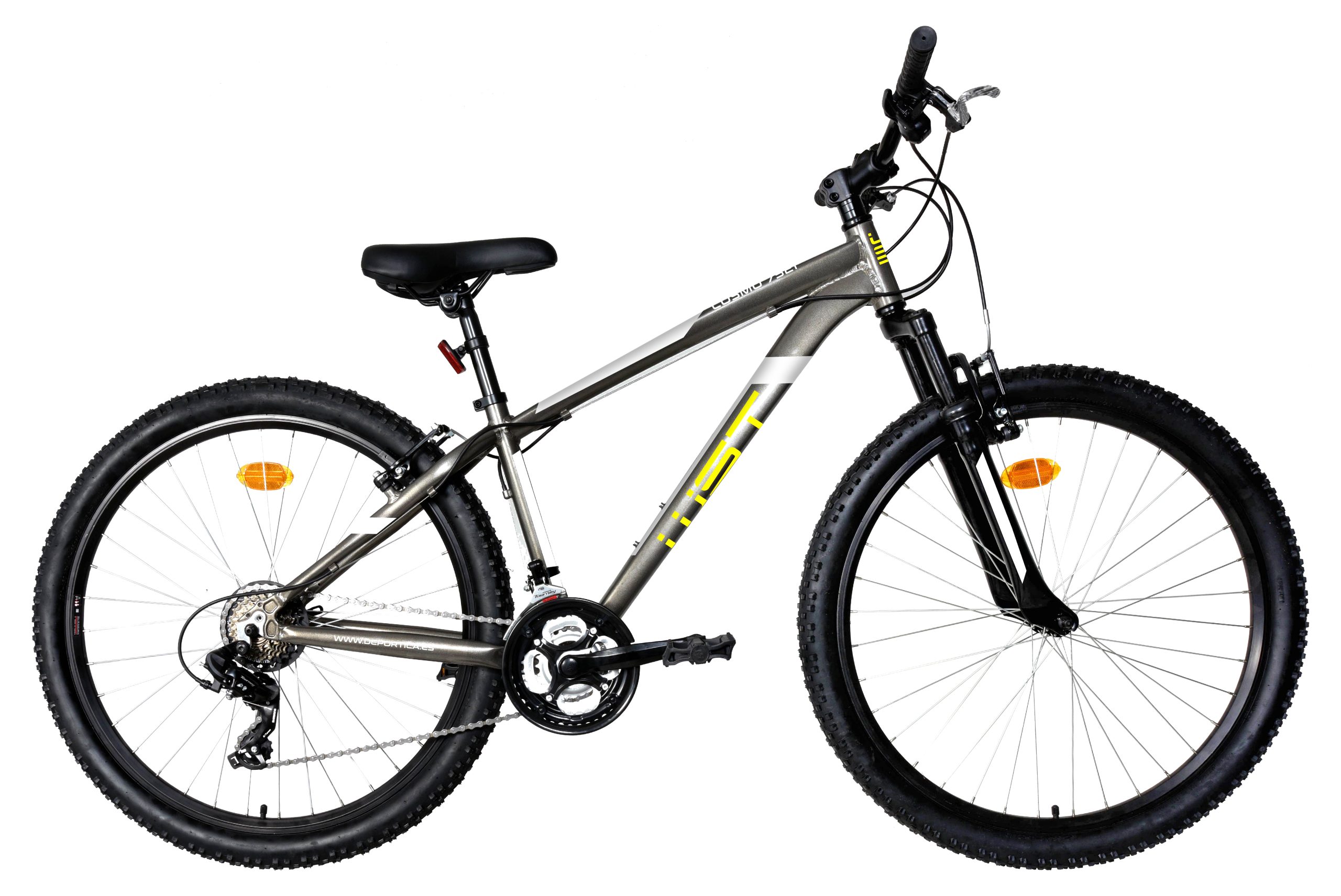 La bicicleta de montaña WST Cosmo 27,5″ con disco mecánico es un modelo de iniciación con cuadro de aluminio, horquilla de suspensión y transmisión Shimano Tourney de 21 velocidades, diseñada para rutas suaves y uso recreativo.